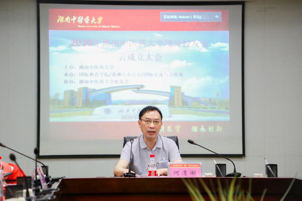 何清湖代表大学对境外校友会的成立表示祝贺,感谢校友们对母校的关心和支持,为母校发展添砖加瓦。他指出,2020是难忘的一年,也是充满爱的一年。新冠疫情肆虐全球,世界各国面临严峻挑战,中医药在这次疫情防控中发挥了重要作用,尤其是对疑似和轻症患者的分层干预、危重症患者协同救治、中医适宜技术的辅助治疗等方面。因此,我们要更加坚定中医药文化自信,中医药是民族的,也是世界的。母校将秉承“质量办学、开放办学、特色办学”的理念,继续做好人才培养、科学研究、社会服务、文化传承及国际交流合作等五项职能,希望境外校友们继续关注母校的发展。