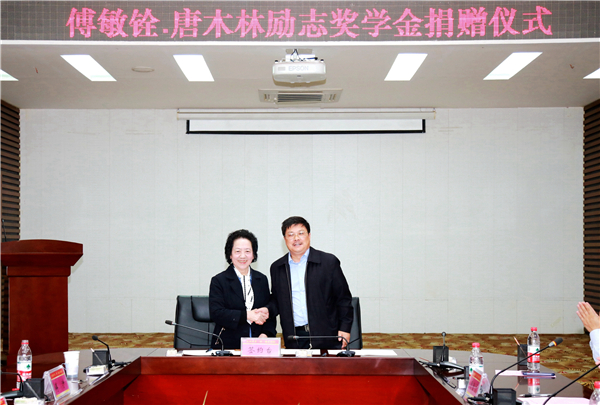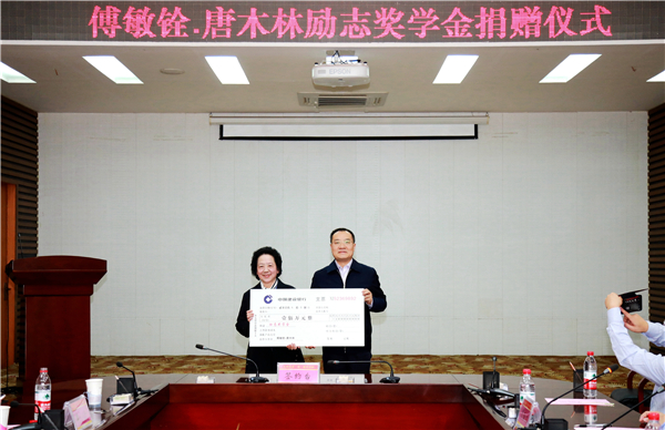 84岁高龄的唐木林老师首先感恩党和国家给予的离休干部政策,让她们老有所养、老有所依、老有所乐,衣食无忧,看病有保障。并深情回顾了自己在大学工作和生活的经历。唐老说,当自己再次回到曾经工作过、生活过的校园时,深深感受到了学校这二十年的巨大变化与发展,深深感受到了校院领导对老同志的关心和关爱,为回馈国家、回馈社会,承傅敏铨老师遗愿,决定捐赠一百万元资助品学兼优的贫困学生,帮助他们完成学业,成为祖国需要的人才。